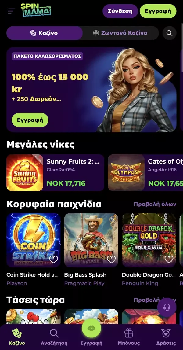 Στο κινητό, διατηρούμε το πλήρες μενού: κουλοχέρηδες, τραπέζια με ζωντανό ντίλερ, κλασικά επιτραπέζια παιχνίδια, τζάκποτ, βιντεοπόκερ, ξυστά και αθλητικό στοίχημα. Αν σας αρέσουν οι γρήγορες συνεδρίες, οι κουλοχέρηδες Spinmama και οι τίτλοι με Αγορά Μπόνους (Bonus Buy) είναι εύκολα προσβάσιμοι από το λόμπι και τα εργαλεία αναζήτησης. Για παίκτες που θέλουν τοπική σαφήνεια, η πρόσβαση στο καζίνο Spinmama Ελλάδα είναι σχεδιασμένη γύρω από EUR, γρήγορες καταθέσεις και ξεκάθαρα χρονικά πλαίσια ανάληψης.